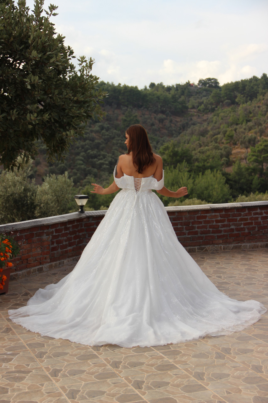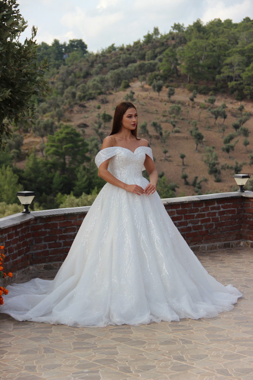 İnci Model, omuzları açık tasarımı ve ışıltılı detaylarıyla romantik ve zarif bir gelinlik sunuyor.