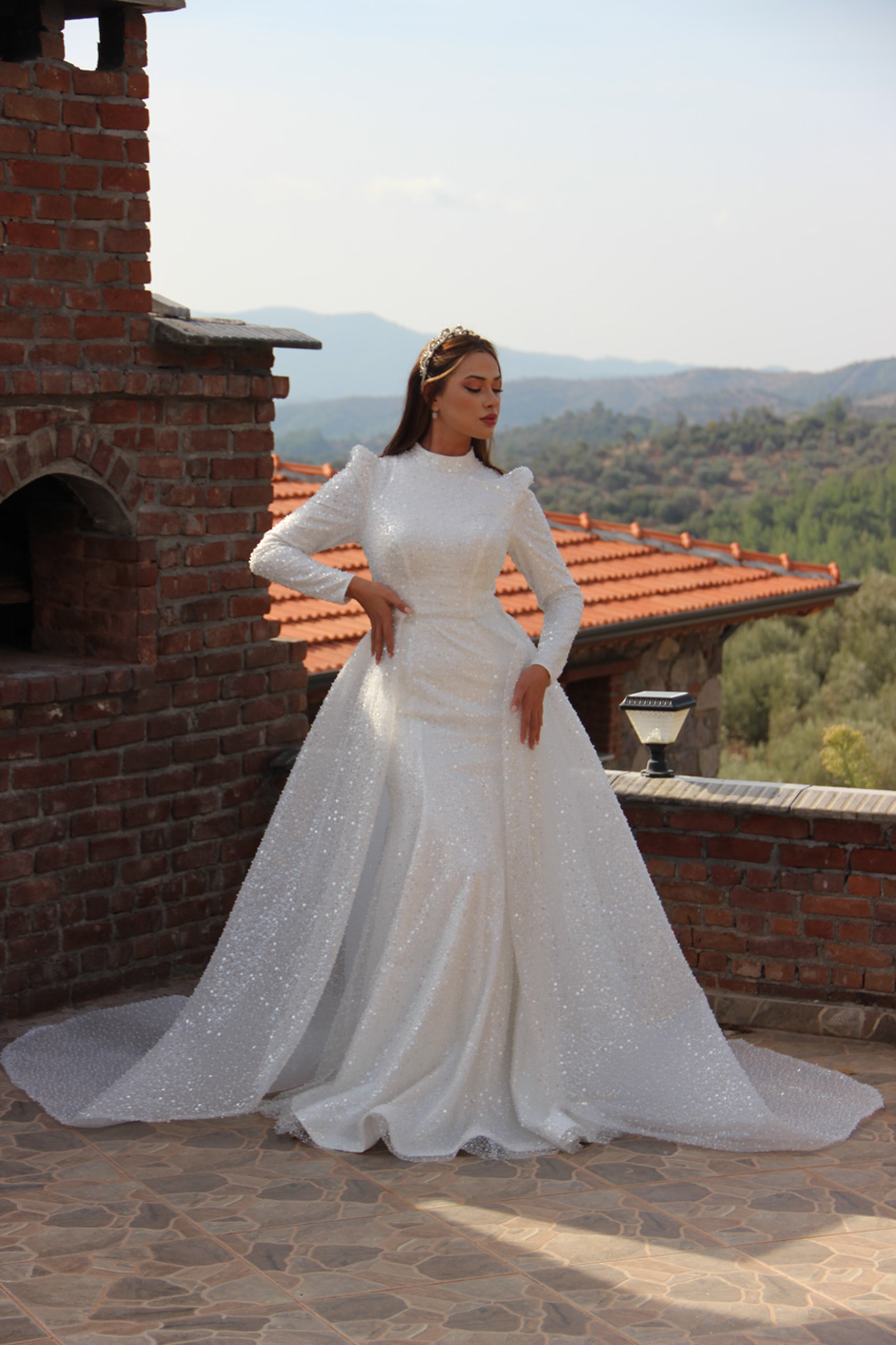 Karen Model, zarafeti ve ihtişamı bir araya getiren modern bir gelinlik tasarımıdır. Uzun kollu ve yüksek yakalı tasarımı, asil bir duruş sergilerken, tamamen ışıltılı kumaşıyla göz kamaştırıcı bir görünüm sunar. Vücuda oturan kesimi, kadınsı hatları ön plana çıkarırken, çıkarılabilir uzun pelerin detayıyla büyüleyici bir hava yaratır. Karen Model, hem klasik hem de modern bir stil arayan gelinler için mükemmel bir seçimdir.