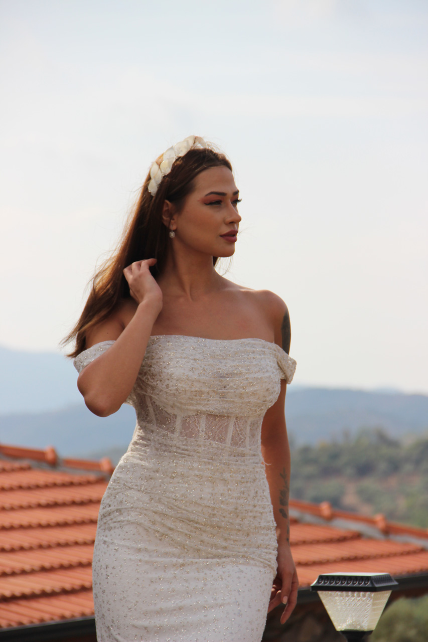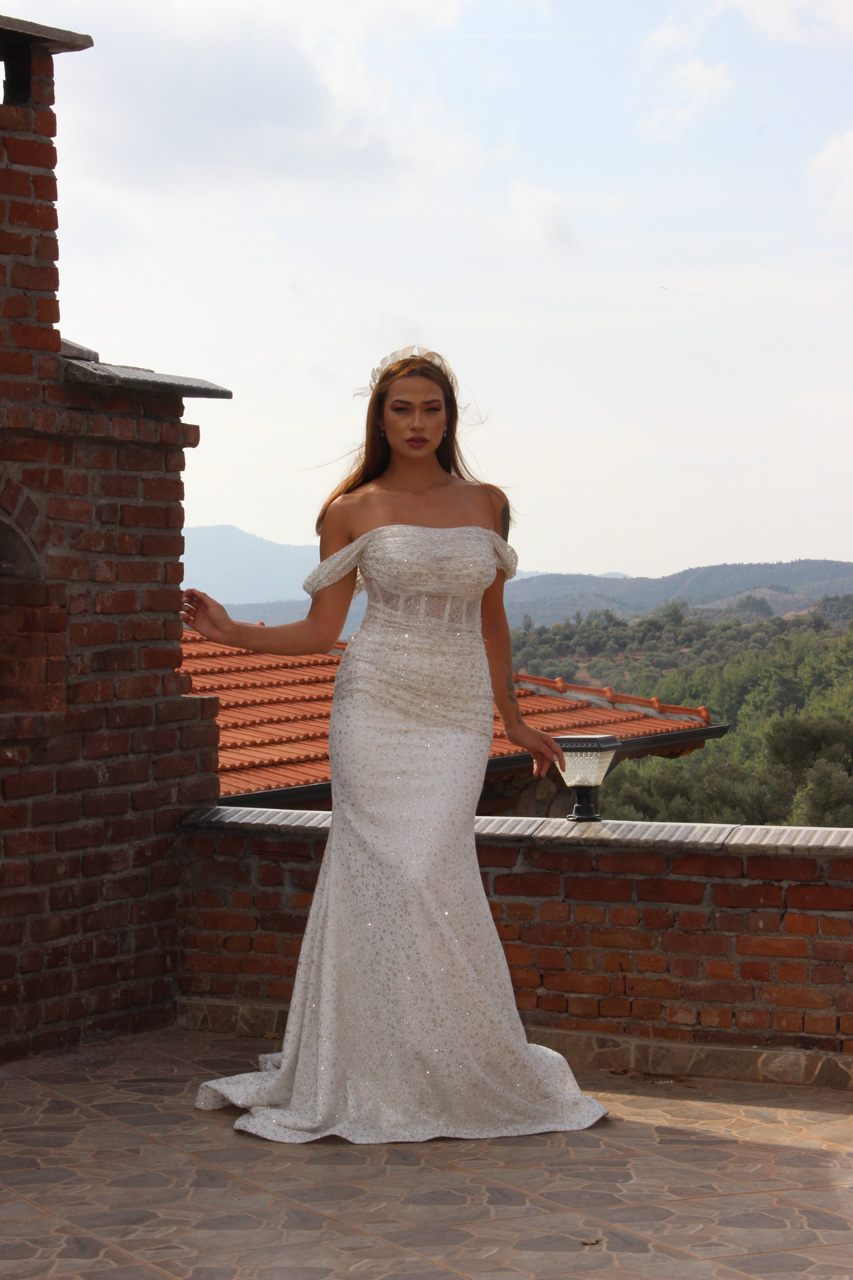Stare Model, zarif ve modern detaylarıyla göz kamaştıran bir gelinlik tasarımıdır. Omuzları açık tasarımı, romantik bir şıklık sunarken, vücuda oturan kesimiyle kadınsı hatları ön plana çıkarır. Işıltılı kumaşı ve ince işlemeleri, gelinliğe büyüleyici bir hava katar. Kuyruk detayıyla tamamlanan Stare Model, hem sade hem de etkileyici bir görünüm arayan gelinler için mükemmel bir seçimdir.